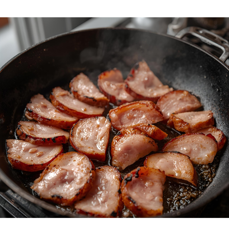 Step 3: Caramelize onion or shallot in butter for 10 minutes until golden and sweet. Slice or chop large ham slices and fry them in a pan with oil and seasonings. Add honey and maple syrup to taste.